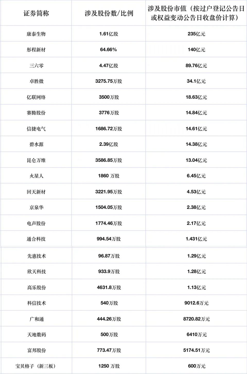 具体来看,涉及的公司包括三六零(601360.SH)、富邦股份(300387.SZ)、卓胜微(300782.SZ)、昆仑万维(300418.SZ)、京泉华(002885.SZ)、彤程新材(603650.SH)、科信技术(300565.SZ)、回天新材(300041.SZ)、赛腾股份(603283.SH)、广和通(300638.SZ)、火星人(300894.SZ)、碧水源(300070.SZ)、通合科技(300491.SZ)、康泰生物(300601.SZ)等。