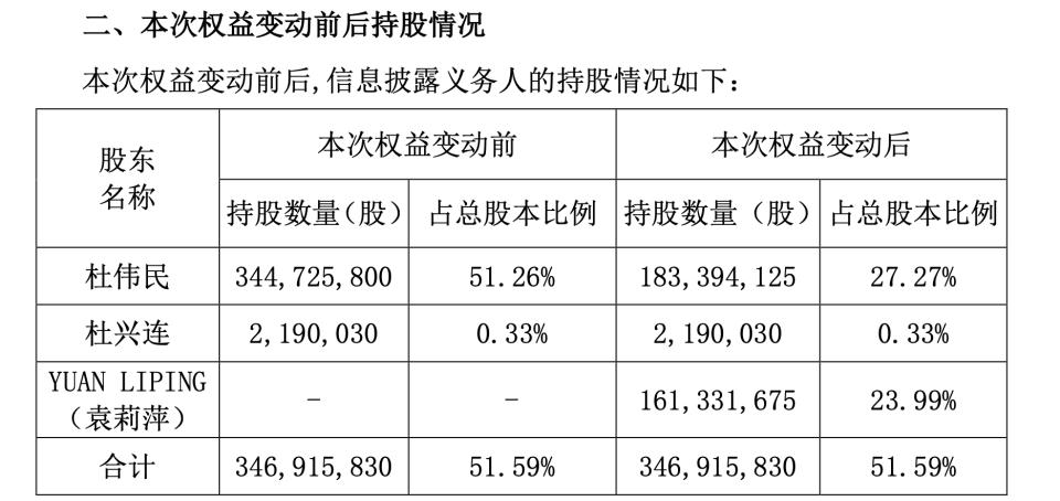 康泰生物在2020年5月29日一份简式权益变动公告中宣布,因解除婚姻关系并进行财产分割,公司实控人杜伟民将其直接持有的约1.61亿股公司股份(占公司总股本23.99%)分割至YUAN LIPING(袁莉萍)名下。权益变动后,杜伟民持股比例由51.26%降至27.27%,袁莉萍持股比例由0升至23.99%。