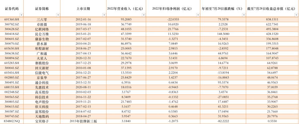 以7月28日收盘来看,上述22家公司中市值超过百亿的有9家,最高的是三六零(约838亿元),其次为卓胜微(约622亿元)、亿联网络(约495亿元)、昆仑万维(约428亿元)、康泰生物(约336亿元)等。股价涨幅方面,年初至7月28日收盘,10家公司区间涨幅超过30%,其中昆仑万维区间大涨148%,通合科技、三六零分别涨约95%、79%。