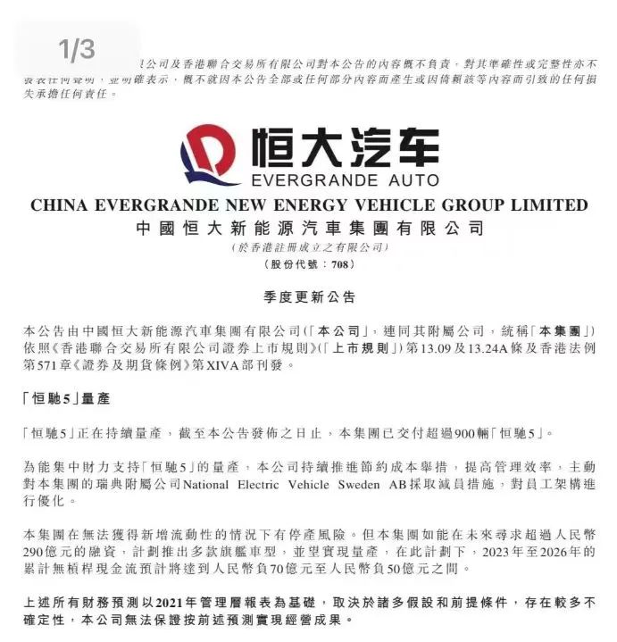 早在今年 3 月,恒大汽车曾透露,在无法获得新增流动性的情况下有停产风险。