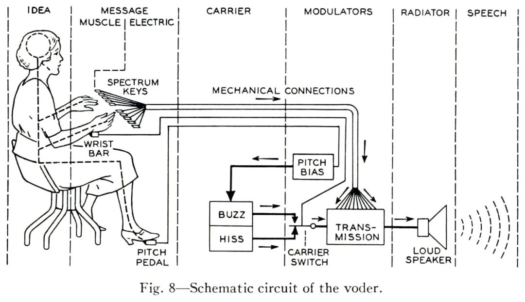 1937年,一种新的设备出现了,它不是靠机械驱动,而是靠电来发声,加上娴熟的演奏技巧,人们获得了一种真的能说话的电设备:Voder。
