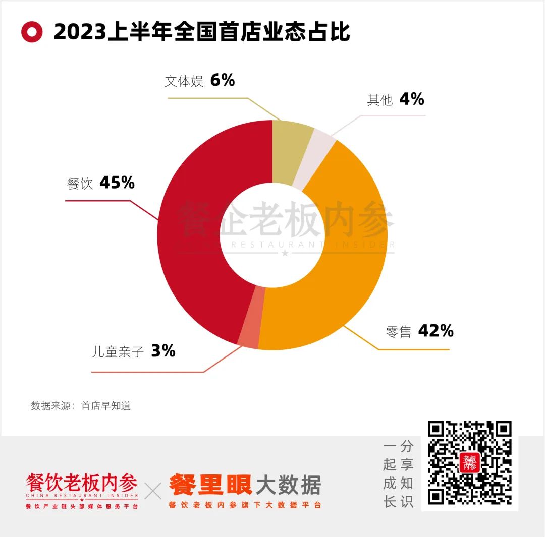 第二,首店经济仍处于快速发展中。据首店早知道不完全数据统计,2023年1月-6月20日,共收录1172家首店,餐饮品类占比45%,其中咖啡、酸奶、茶饮等饮品类的首店众多。
