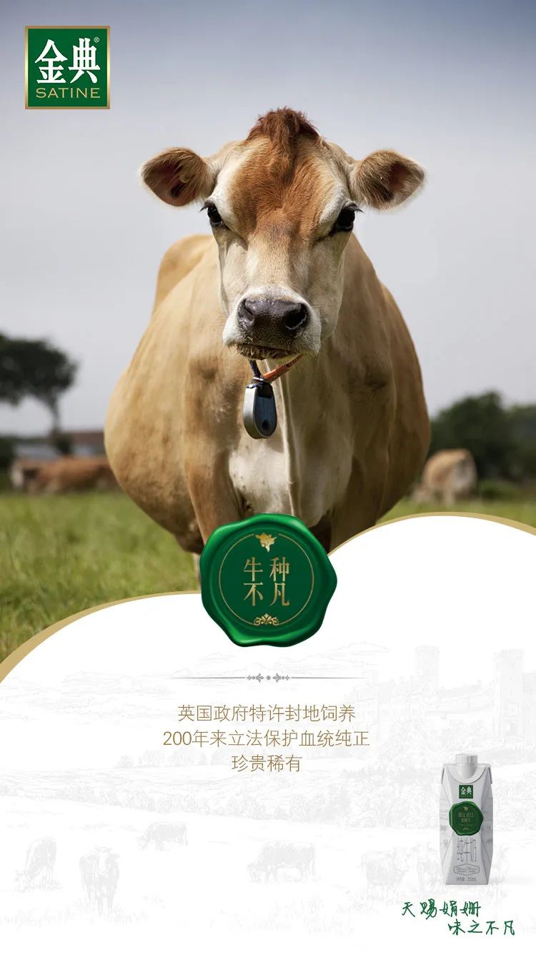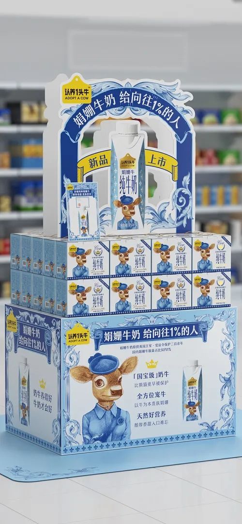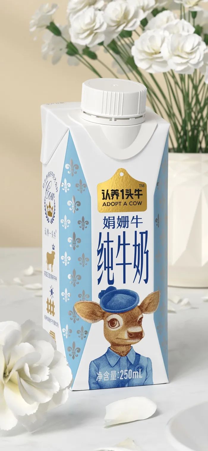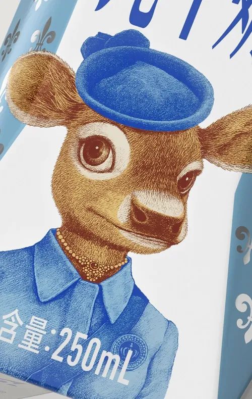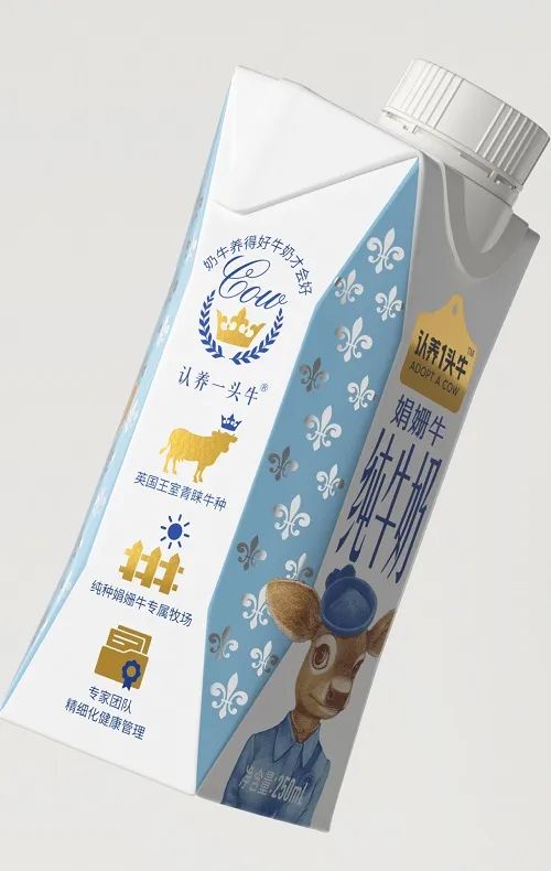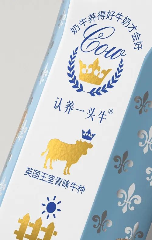 在包装设计上,认养一头牛将娟姗牛直接印上产品包装盒,并给牛戴上欧洲王室成员在重要场合佩戴的礼帽和绶带,然后用象征贵族血统的蓝色作为标准色,以及贵族服饰中常用的鸢尾纹样作为辅助图形[3]。这就是通过可见的娟姗牛背书,来证明品牌的高端。