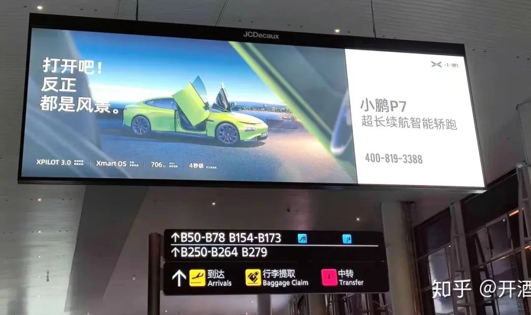 但是这并不妨碍,小鹏汽车为这台车投放了大量的广告。前几年出差,我在很多机场都看到过鹏翼版的巨幅海报广告。那么,小鹏为什么要为一台销量注定不大的产品投放那么多广告呢?