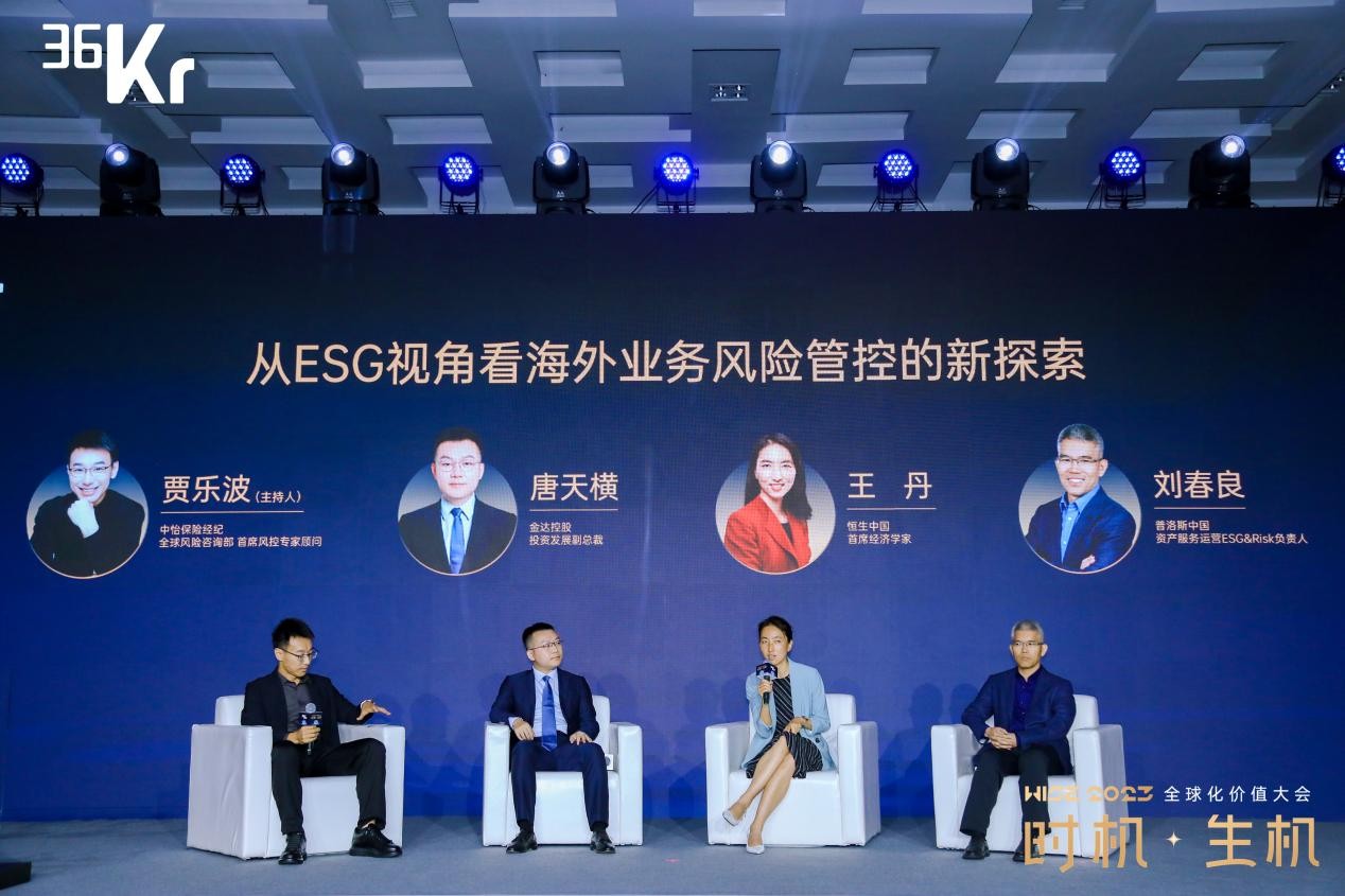 大会的第四场圆桌论坛上,主持人中怡保险经纪全球风险咨询部首席风控专家顾问贾乐波,与金达控股投资发展副总裁唐天横、恒生中国首席经济学家王丹、普洛斯中国资产服务运营ESG&Risk负责人刘春良,围绕如何从ESG视角看待海外业务风险管控这一话题展开了热烈的讨论。