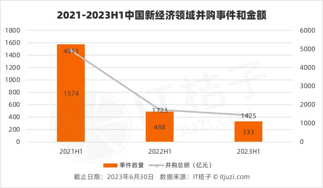 IT 桔子《2023 年上半年一级市场创投报告》显示,2023 上半年中国新经济领域发生并购事件 333 起,同比下降 31.97%;其中并购金额超过 10 亿元事件有 25 起,同比下降 64.79%;并购交易规模为 1425 亿元,同比下降 17.3%。