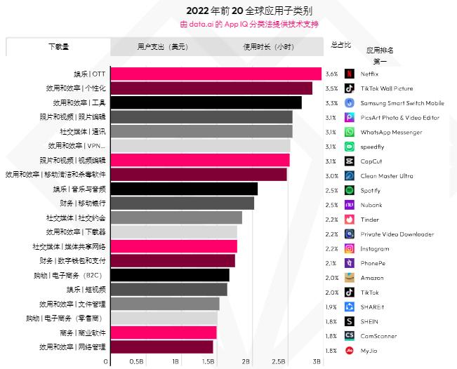精神需求的刚需性叠加泛娱乐APP借助多种方式满足用户需求,也让泛娱乐APP具有以下特点。,一是用户对泛娱乐类APP的需求较为庞大。潜在用户需求庞大,据data.ai数据显示,在2022年全球前20的应用子类别中,娱乐/OTT拿下下载量和用户支持双第一。
