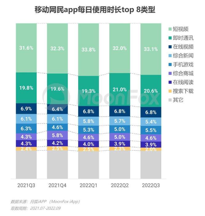 二是相较于其他类别APP而言,泛娱乐APP用户使用时长高、日活数据可观。一方面月狐相关数据显示,自2021年Q3到2022年Q3,短视频使用时长虽有所波活动,但一直在用户使用时长中占比最高。