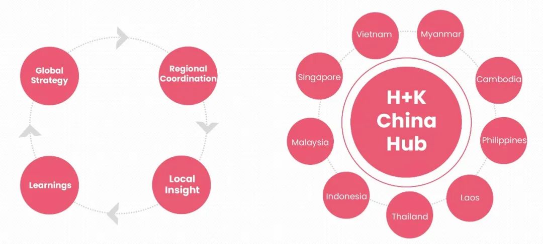伟达作为全球领先的国际公共关系咨询公司,以及第一家进入中国的国际公关公司,不仅对东南亚市场的复杂形势有深刻的了解和丰富的经验,而且能够理解中国客户的需求,并进行高效的沟通。基于伟达的 H+K China Hub 模型,位于北京、上海、深圳、广州、香港的办公室负责与中国企业的深度沟通,包括进入市场前的建议、整体的公共传播策略,同时帮助中国企业与东南亚的资源进行对接,以实现对当地的深度理解,促使本地化项目的顺利执行。