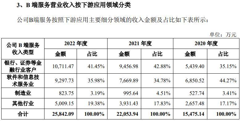 合合信息的B端客户主要以金融行业、软件和信息技术业、制造业为主,2020年至2022年,B端收入为1.55亿、2.21亿、2.58亿,年复合增长率为29.02%。