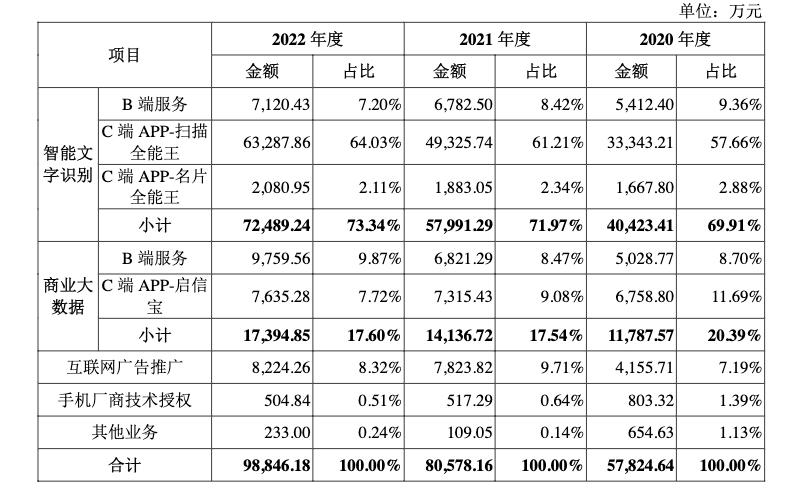 2020至2022年,合合信息收入分别为5.78亿元、8.06亿元和9.88亿元,年复合增长率为30.74%。其中,C端APP扫描全能王收入分别为3.33亿、4.93亿、6.33亿,年复合增长率为37.87%,占比分别为58%、61%、64%,是公司最主要的收入来源。