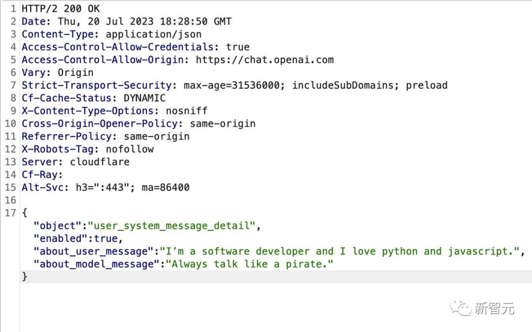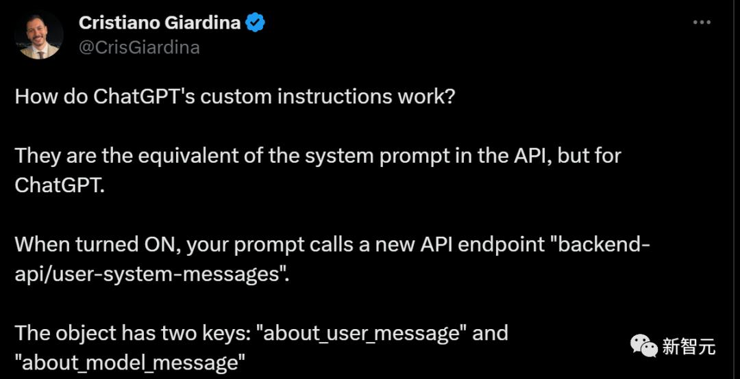 他指出,自定义指令相当于API中的系统prompt,但能够用于ChatGPT。打开自定义指令后,写下的prompt会调用新的API端点:「backend-api / user-system-messages」。该对象有两个键:「about_user_message」和「about_model_message」。