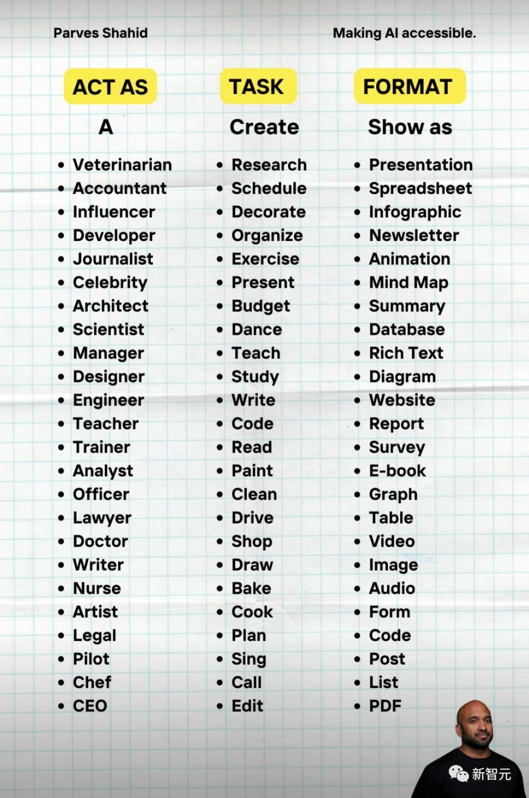 具体来说,就是告诉ChatGPT你需要它充当某个(角色),去执行一类具体的(任务)并且以某种(格式)作为结果进行输出。