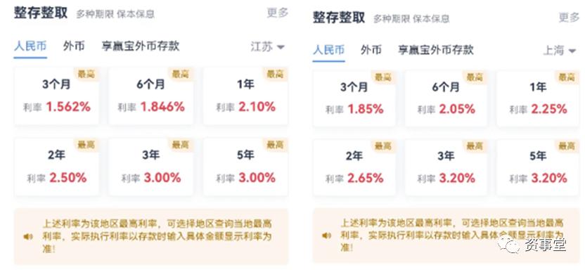 同时,江苏本地区的3年期、5年期的利率整存整取定期存款,利率也从原来的最高3.1%,下调至最高3%。
