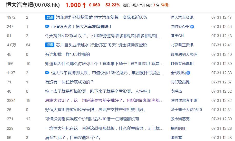 复牌的第二个交易日,恒大汽车的股价收涨53.23%,虽然这是来自汽车行业政策利好,但在阳光普照之中,恒大汽车的股价涨幅却超过经营状况更好的蔚来、小鹏等公司,让投资者互动区中不乏抄底成功和懊悔没有抄底的股民评论。