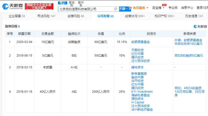 天眼查数据显示,2018年1月16日,自如完成了40亿元人民币A轮融资,总估值超200亿人民币,成长为长租公寓领域第一支独角兽企业。