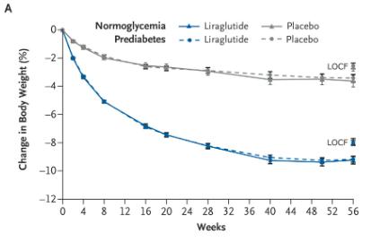 利拉鲁肽 3 项 Ⅲ 期临床试验显示,较基线体重降低 5% 和 10% 的患者比例分别为 60% 和三分之一 [6]。
