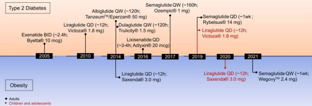 诺和诺德开发的利拉鲁肽最早于 2009 年在欧盟作为 2 型糖尿病药物上市。2014 年 12 月,美国 FDA 批准其「超重或肥胖」的新适应症,开辟了 GLP-1 类药物用于超重、肥胖治疗的先河。