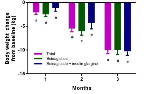 患者在常规诊疗环境中接受治疗,215 例给予贝那鲁肽单药,96 例给予贝那鲁肽联合甘精胰岛素,3 例在上述两种方案基础上联用二甲双胍。1~2 周剂量滴定期后,超三分之二的患者贝那鲁肽日剂量 ≥ 0.3mg,约二分之一的患者贝那鲁肽日剂量 ≥ 0.48mg。