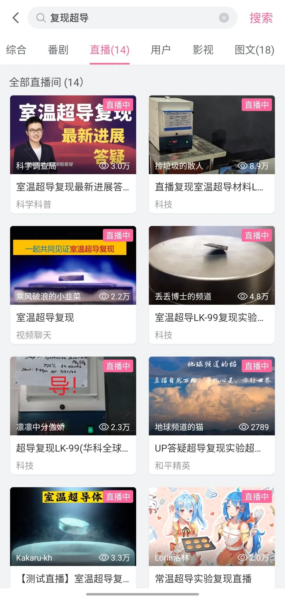 B站正在直播复现室温超导的频道 | Bilibili截图