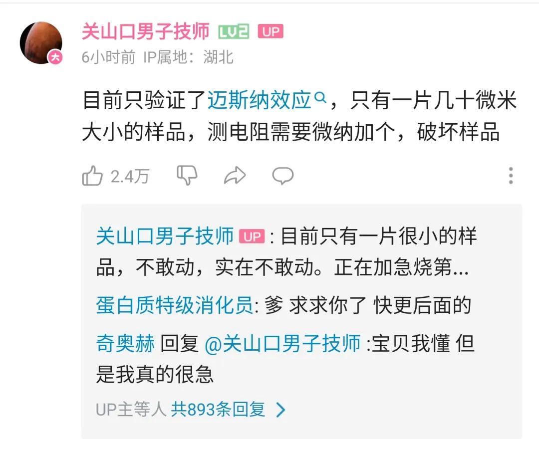 可惜的是,受到样品条件限制,复现磁悬浮的样品还无法用于测量电阻。华中大的实验室已经在制备新一批样品,希望能进一步测量出LK-99的电阻特性。