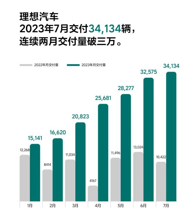 蔚小理三家中销量最高的仍然还是理想。2023 年 7 月,理想汽车共计交付新车 34,134 辆,同比增长 227.5%,并已连续两个月交付量突破三万。至此,理想汽车 2023 年累计交付量已经达到 173,251 辆。