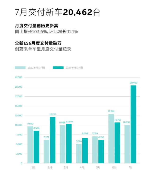 2023 年 7 月,蔚来交付新车 20,462 台,同比增长 103.6%,环比增长 91.1%,交付量创历史新高。蔚来的投资者关系部门透露,蔚来的交付量中包括 14,066 辆 SUV 和 6,396 辆轿车。
