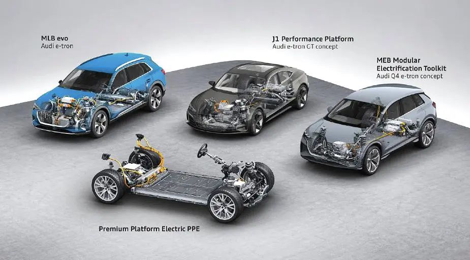 从大众集团的角度来看,MEB是大众的纯电模块化平台,支持电压为400V,像是ID.系列、Q4 e-tron均出自该平台;MLB evo是燃油车时代的产物,同时也是纵置发动机平台,在此平台上诞生了A4、A6这样的燃油车型,当然也包括e-tron和e-tron Sportback这样的电车,只不过它们是公认的“油改电”车型;PPE平台被奥迪寄予厚望,同时这也是奥迪与保时捷共同开发的适用于大尺寸、豪华型纯电车型的平台,首款车型将为一汽-奥迪生产的Q6 e-tron,只不过奥迪一汽长春工厂仍在建设中,预计2024年底才能完工投产;J1是由保时捷主导开发的高性能纯电平台,像是保时捷Taycan、奥迪e-tron GT均诞生于这一平台。