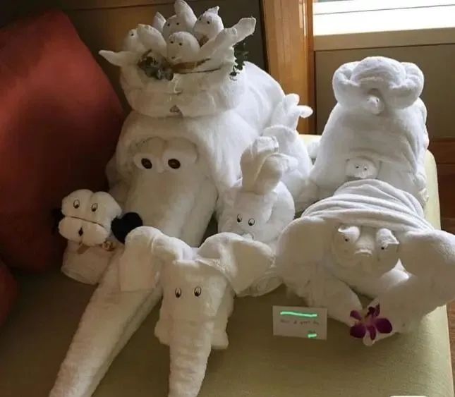 埃及酒店叠毛巾的服务吸引了一大批住客的注意力,各国酒店以及游轮闻风而动,服务员们纷纷化身毛巾侠卷了起来。