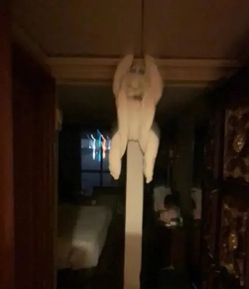 一只尸首分离、耷拉着双腿并带着蜜汁微笑的不明生物悬挂在房梁上。
