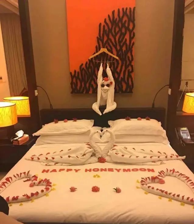 马尔代夫无愧为蜜月圣地,就连客房中的毛巾艺术品都透露着甜蜜气息,只是……头顶的小人是不是有点煞风景了?