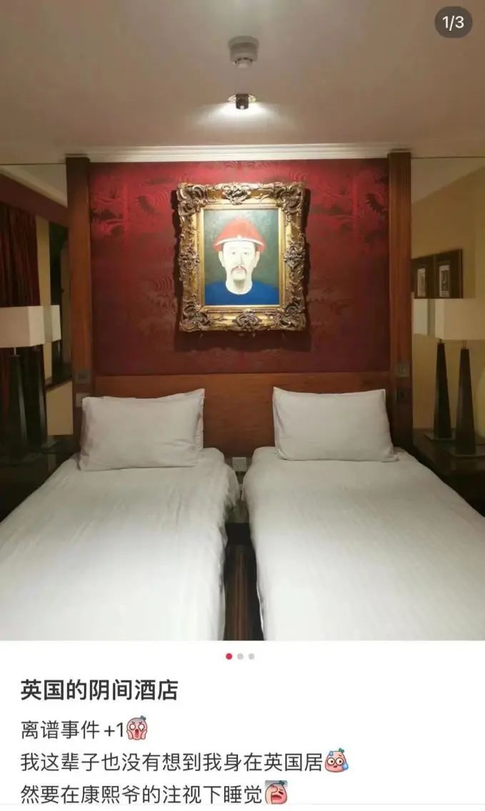 英国的酒店与这间兵马俑酒店也有着异曲同工之妙,康熙爷色彩鲜艳的画像就这么明晃晃地挂在床头。