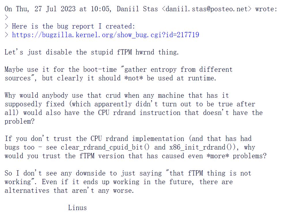 不曾想时隔三年,看似力挺 AMD 的 Linus 最近却开始对 AMD 的 fTPM 功能表达了强烈不满:“让我们禁用愚蠢的 fTPM hwrnd 吧!”