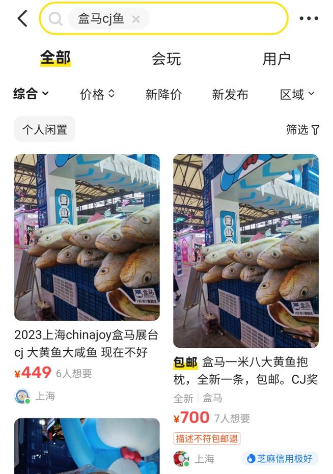 盒马则以充满中二气息的IP换皮和文案来迎合Z世代审美。以《盒马王国之人间菜场》为主题,处处体现盒马的无厘头文化。一米八的大黄鱼抱枕成为CJ周边MVP,二手价格也一度被炒至700元!