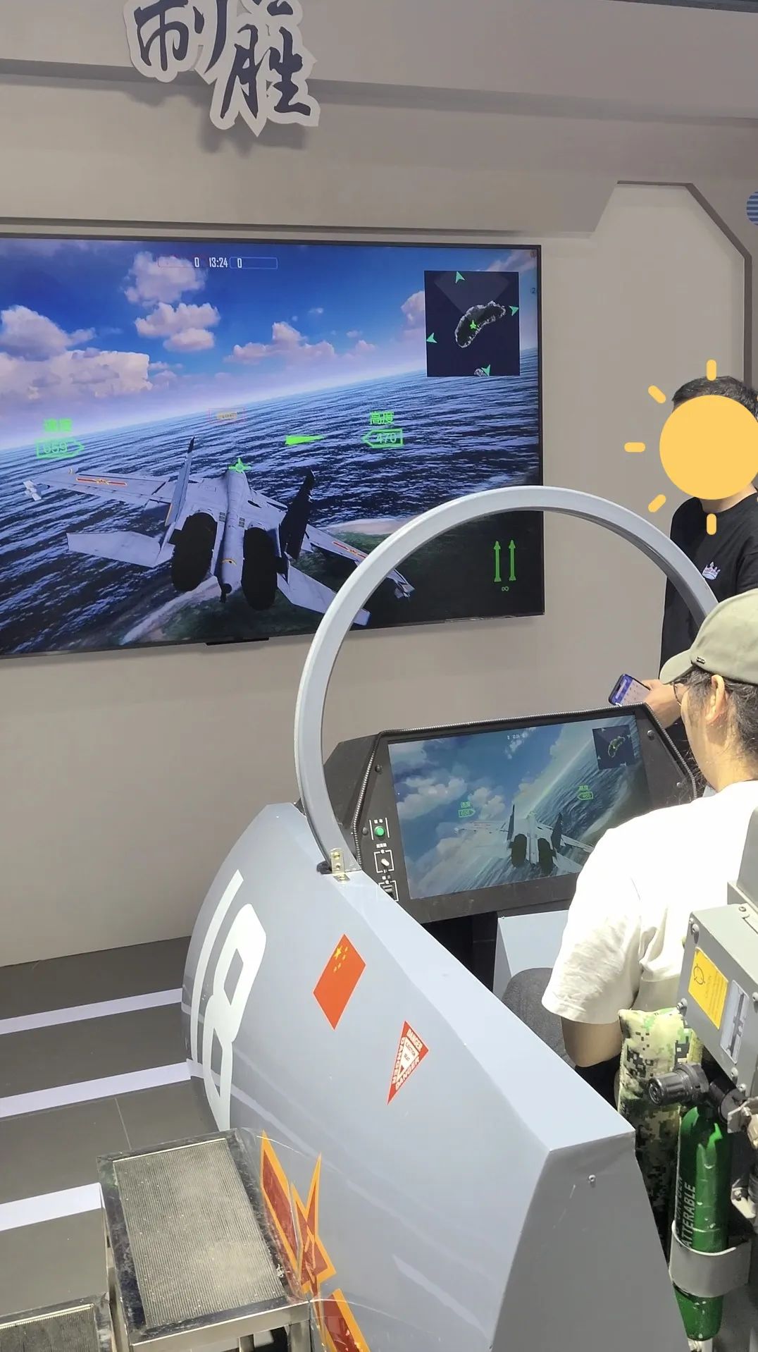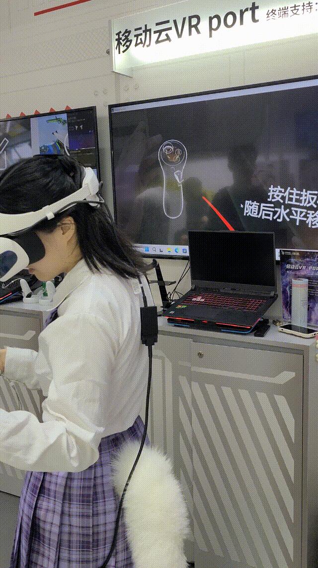 科技展区这边,三星在4K超宽电竞屏上播放赛车比赛,玩家可以手持方向盘参与游戏,提供了极高的沉浸感和互动性。中国移动则带来了一系列VR产品。
