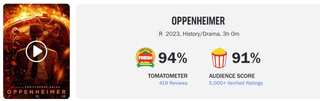 从口碑来看,《奥本海默》的烂番茄新鲜度达到94%,影评人表示其“标志着克里斯托弗·诺兰的另一项引人入胜的成就,这得益于墨菲的精彩表演和令人惊叹的视觉效果”;同时《奥本海默》的爆米花指数冲高至91%,获得媒体和观众的齐声褒扬。