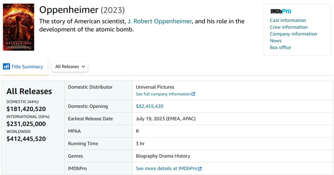 纵观今年的暑期档,《奥本海默》足以排到单片首映票房的第5名,远高于《速度与激情10》、《夺宝奇兵5:命运转盘》和《碟中谍7》等超大制作。