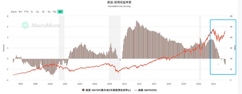 在上图中我们看到在美股此轮上涨中,市盈率得到很大扩张,这也就压缩了市场盈余收益率,与两年国债收益率相比出现了收益率倒挂,股市的风险并没有得到足够的收益补偿。