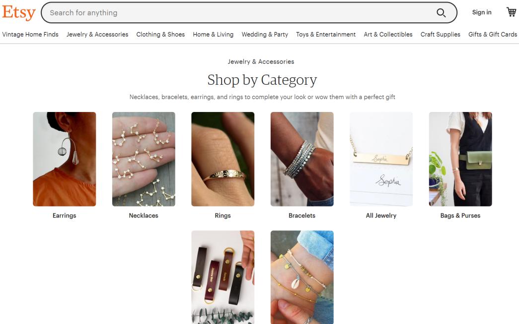 Esty主营八大类目,每个类目细分下的上百个小类目,产品的选择空间非常大,涉及到原创手工设计元素的产品非常多。对于在亚马逊等平台为标品价格战而头痛的卖家来说,Esty的机会,可以考察考察。