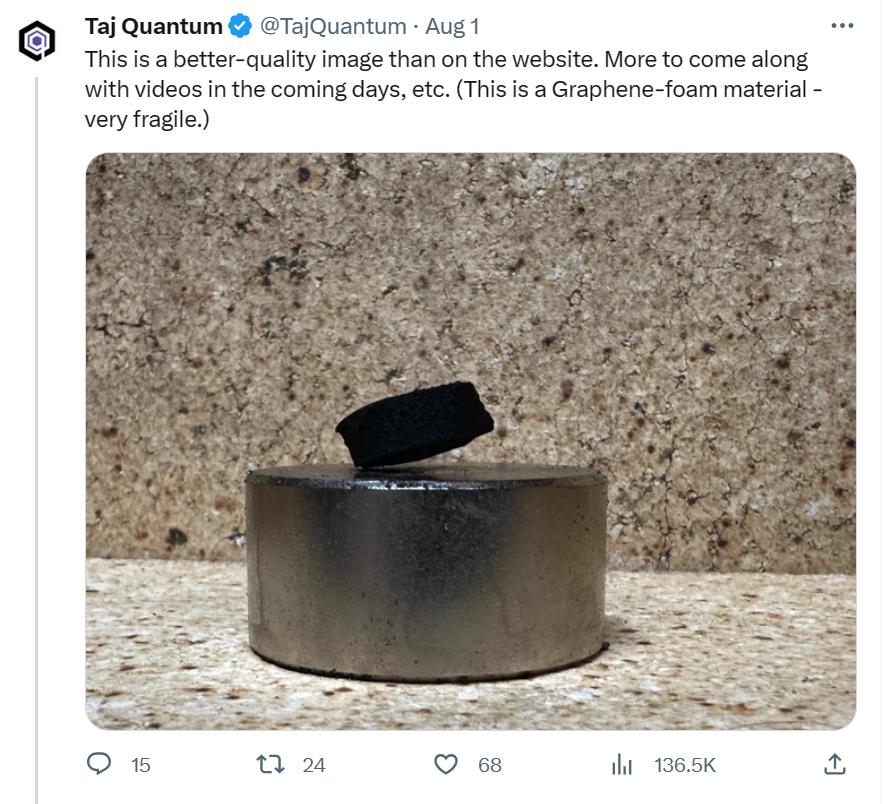 就在真相扑朔迷离之际,美国公司Taj Quantum公布照片,生成新发现一种易碎的石墨烯泡沫材料,也是室温超导材料。