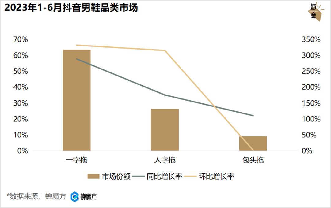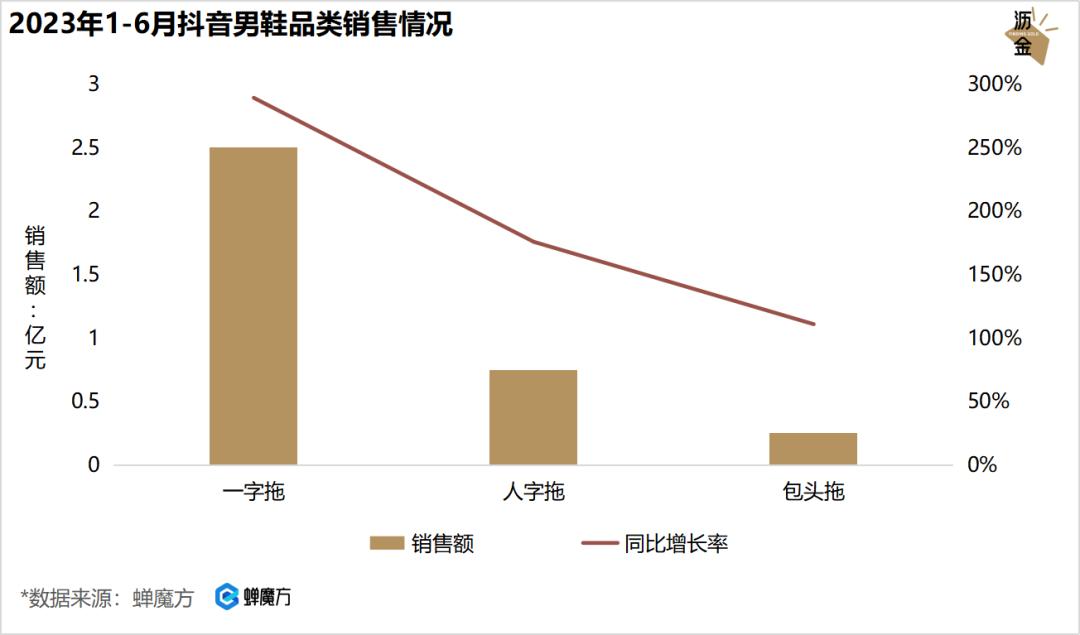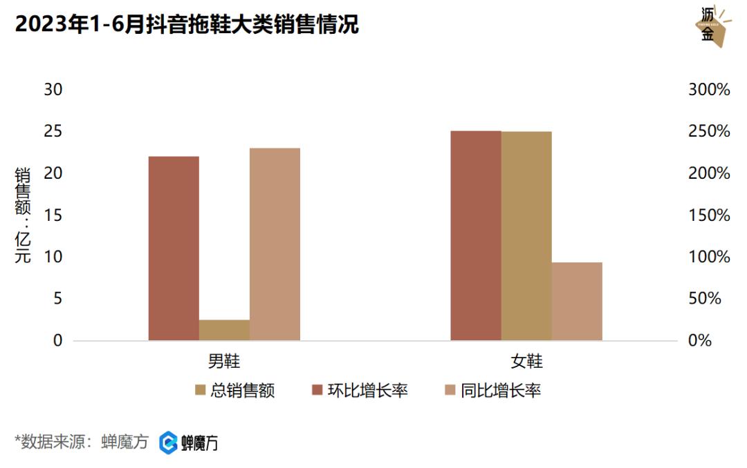 具体看抖音,今年上半年,抖音男拖总销售额超2亿,同比大涨230%,女拖总销售额超20亿,同比涨幅93%,增速迅猛。