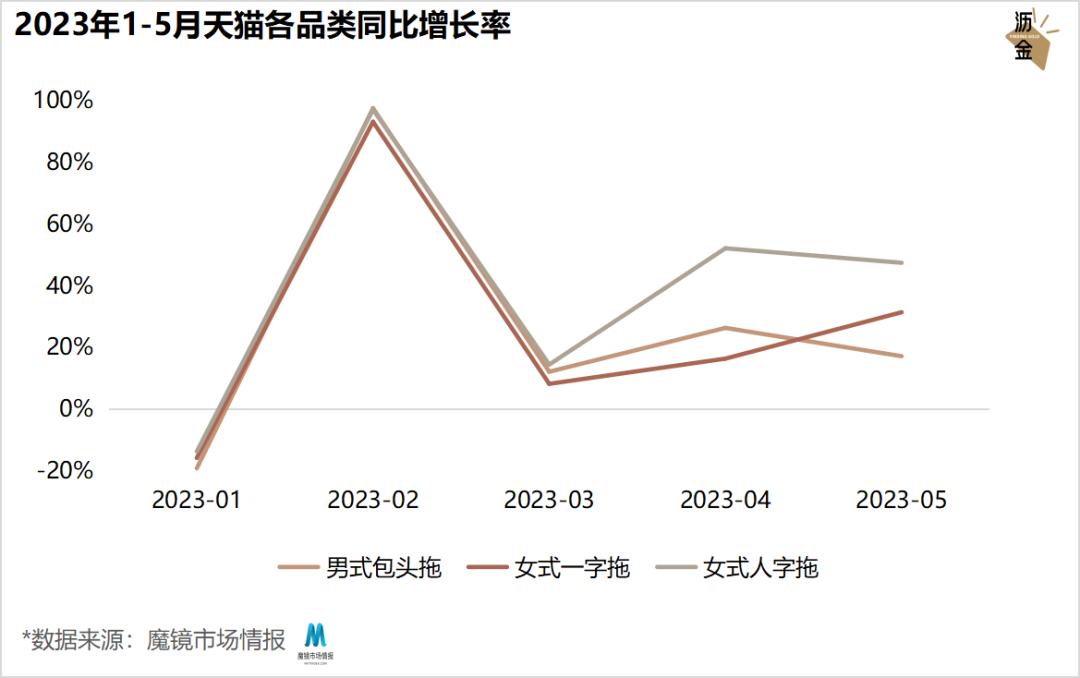 今年年初开始,天猫拖鞋一路高歌猛进。其中,女拖增长飞快,每月销售额和同比均超男拖至少两倍以上。