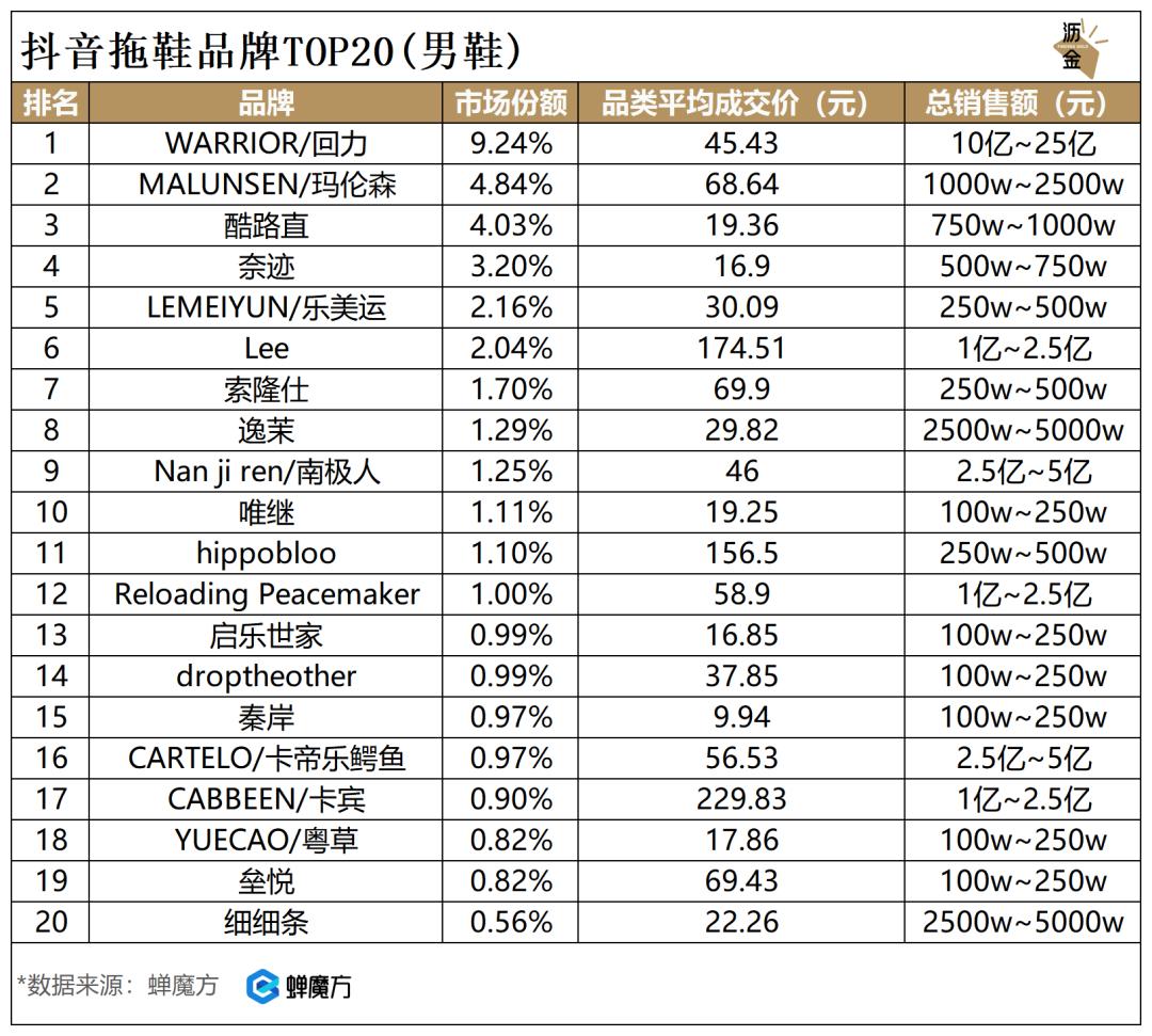 抖音拖鞋品牌TOP20(男鞋)