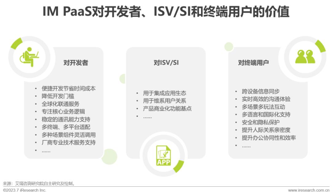 IM PaaS通过API或SDK的形态交付,直接或间接为开发者、ISV/SI和终端用户带来了丰富的价值:1)开发者是IM PaaS的主要服务对象,也是IM PaaS价值的首要体验者。IM PaaS为开发者提供全球化、可扩展、功能稳定的通信支持,让开发者能便捷、灵活地进行二次开发,降低开发门槛同时节省了大量时间成本。2)ISV/SI是IM PaaS的间接使用方,通过集成IM能力,让产品具有交互性,创造更多商业价值。3)终端用户是IM PaaS的最终使用方和受益者,经过多轮开发、测试和封装,IM PaaS最终以应用为载体展现其通信功能,让用户享受到实时、高效、安全的沟通体验。