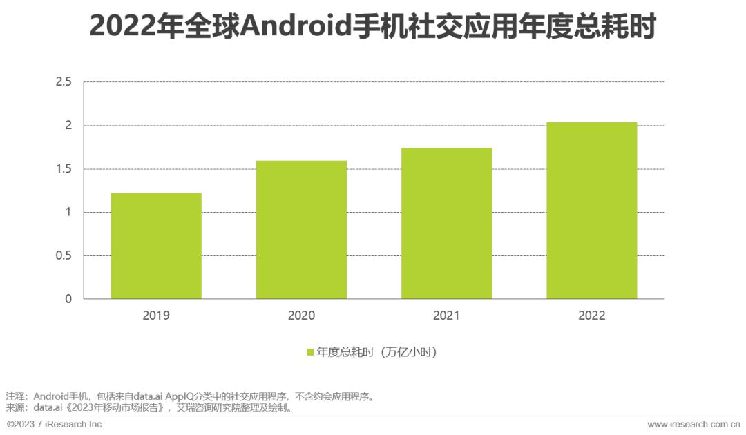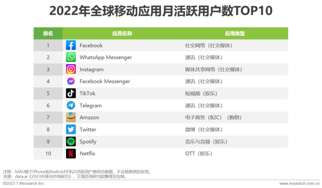 通信于互联网应用而言属于刚性需求,受到新冠疫情的影响,越来越多的沟通行为转移到线上,社交娱乐类应用的活跃度持续走高。据统计,2022年全球Android用户在社交应用上的年度总耗时达到2万小时以上,同比上升17%。同年,全球月活跃用户数TOP10的APP中,不仅WhatsApp Messenger、Facebook Messenger、Telegram榜上有名,其他非即时通讯类APP中也大多有IM功能的集成,通过为用户提供便捷的交流、分享工具,增加用户粘性和留存率。