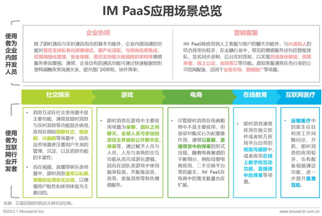 在大部分场景中,即时通讯功能均会配备实时通讯功能使用,但即时通讯在企业内部沟通、客服、陌生人社交中使用频次更高。当IM PaaS的使用者为企业内部开发人员时,在企业协同与营销客服上,对于功能集成、可以支持的部署模式等更为看重,提升企业内部协作效率,加强企业对外部客户的吸引力。在使用者为互联网行业开发者的场景中,1)社交娱乐、游戏、电商等场景上更多注重人员关系的沉淀,客户丰富的互动体验,2)而在互联网+教育/医疗等行业,则可发挥辅助作用帮助平衡医疗或教育资源,加强医患关系、师生关系的紧密性。