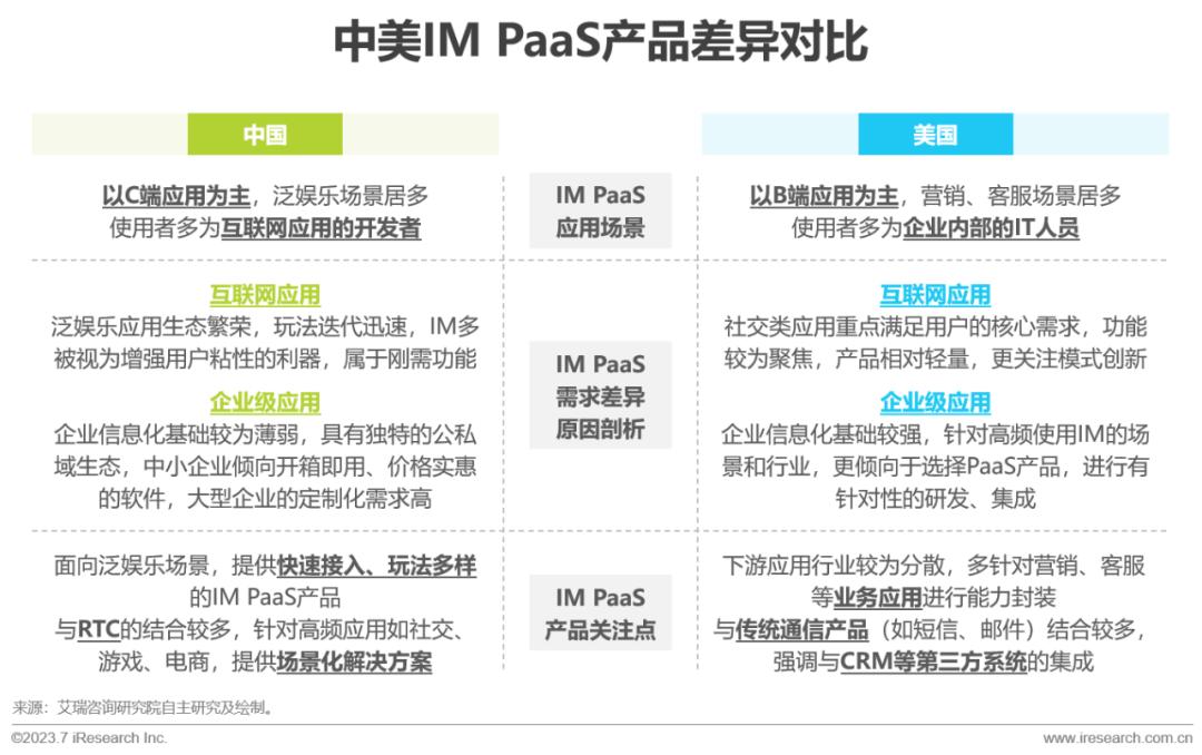 在单聊、聊天室、群聊的基础产品之上,由于中美两国文化与技术的不同,两国的IM PaaS厂商衍生出了不同的发展路径。美国的IM PaaS厂商倾向于为营销、客服场景提供底层通信能力,而中国厂商在互联网泛娱乐领域的探索更多,如针对社交、游戏、电商等高频应用场景,打包场景化的解决方案。