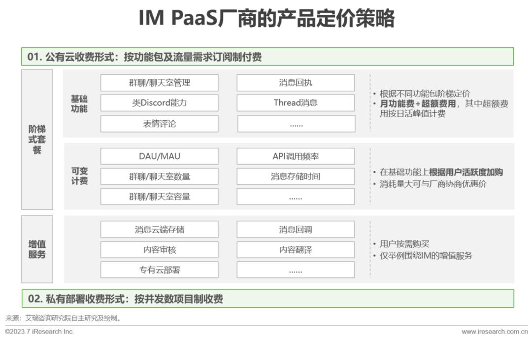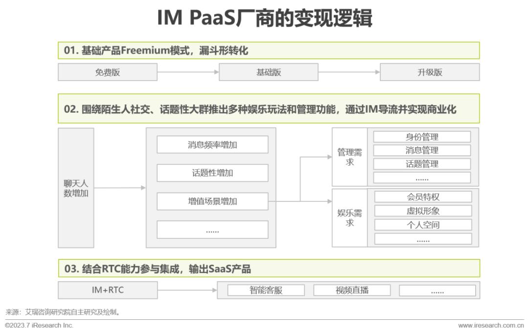目前国内IM PaaS厂商的商业化路径有3种:1)基础产品按功能分套餐包,按月活及用量定价,并围绕消息内容处理及通信行为优化拓展增值服务,是通用定价模式。2)通过IM引流,为用户提供多样化娱乐玩法实现商业变现,适合业务线多、有终端应用输出的综合型厂商。3)拓展RTC产品线,并通过商业合作参与功能集成,嵌入智能客服、视频直播等应用中,按产品用量收费。