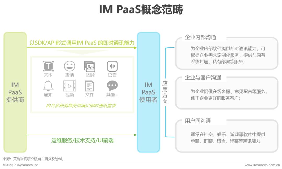 IM PaaS是基于互联网通信原理的即时通讯平台服务。IM PaaS提供商将即时通讯技术封装至平台中,平台可提供包括消息传输、群组管理、会话管理等通讯能力,使用者可以用SDK/API接口形式调用此能力,集成至APP、小程序等应用中,帮助应用实现单聊、群聊、聊天室等即时通讯的功能,同时通过支持丰富的消息类型来满足多元化通讯需求。发展至今,IM PaaS在基本即时通讯功能之外,衍生出如内容审核等多种增值服务,不仅满足了企业内部、企业与客户、用户之间的沟通需要,更赋能社交娱乐、游戏、元宇宙等应用场景,为用户打造更丰富的社交体验,增加用户参与度与粘性。