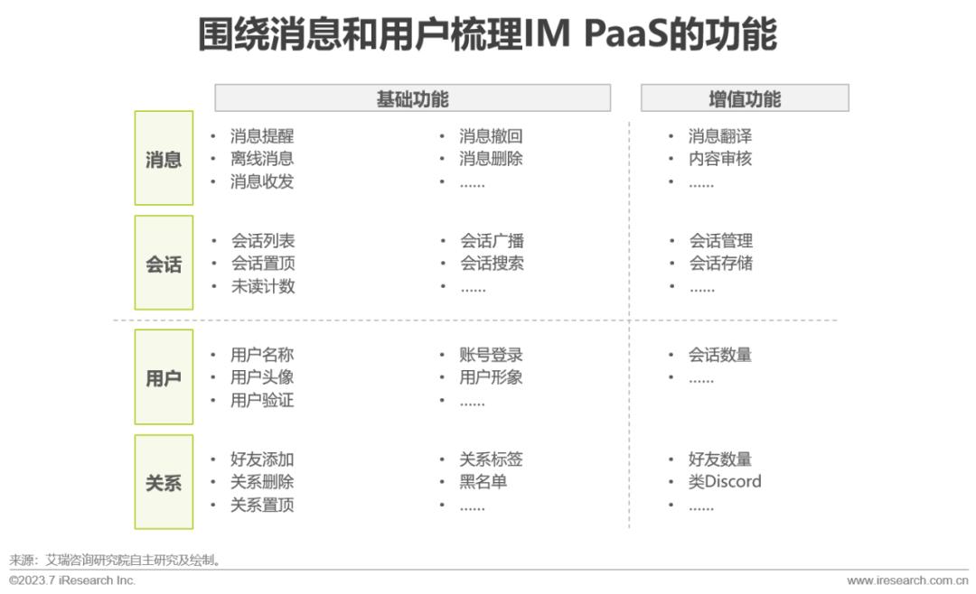 IM PaaS以服务开发者通信应用搭建为目的,围绕消息和用户管理展开功能布局,提供以下能力:1)消息传输及相关能力:用户可通过单聊、群聊等形式,实现快速互动和信息共享,并对消息本身进行删除、翻译等操作。2)会话管理能力:包括聊天会话置顶和未读计数等功能。用户可以将重要的聊天会话置顶,使其始终位于聊天列表的顶部,方便快速访问和回复。3)用户及关系管理:用户可以设置个人资料信息、方便地添加好友,建立联系,并在需要时将某些用户加入黑名单以限制与其的交互。同时,用户还可以创建群组,并邀请其他用户加入,并对群内聊天内容和群成员进行管理。